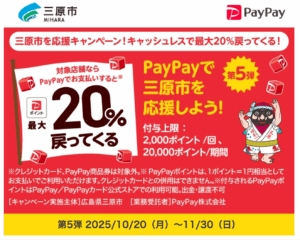 只今、三原市応援キャンペーン!最大20%戻ってきます。